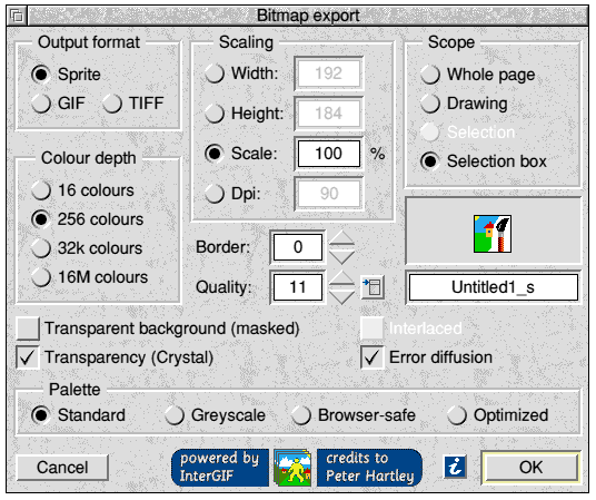 What makes ArtWorks 2 perhaps different from alternative successor programs on both our platform and others is that the tools on offer are a logical extension to those already on offer. Martin has taken the time to upgrade and enhance the functionality of virtually everything including the zoom tool, the select tool, export capability and much more besides. ![]() Artworks2 in action Some of the most useful functionality comes in the shape of new tools on the toolbar including the famed Crystal (providing real transparency for ArtWorks users) and TextEdit (allowing you to treat ArtWorks as a complete desktop publishing package. ![]() Crystal Crystal is very memory intensive in its operation; and the faster the processor the better. If you're looking to use Crystal on an ARM610 Risc PC; you'll be waiting an awful long time in between perform even the most simple of operations, on the other hand try it on an Iyonix and everything is almost instant. A comprehensive manual is supplied, explaining exactly how Crystal works together with the advantages it offers to ArtWorks users. TextEdit allows you to create text frames within your ArtWorks documents and you can either type text straight into them or import text from an alternative file. The style options are basic, but enough to allow the sorts of basic DTP operations you're likely to perform using a graphics package. TextEdit is quick, efficient and we very much like the way it works. ![]() TextEdit Perhaps one of the most useful extensions to ArtWorks 2 has been in the area of file export; most notably the ease with which SVG (scalable vector graphic) and bitmap (TIFF, JPEG or Sprite) files can be exported from the package. Again a lot of memory is required to build up a bitmap version of your document in memory, although it must be added that if you intend to use a document containing transparency in another application you have no choice but to export it as a bitmap. The resolution offered by the resultant images is easily sufficient for professional output. ![]() Bitmap export Conclusions