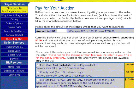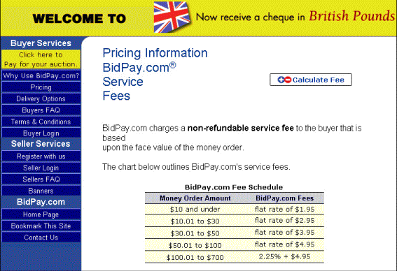 For the auction seller who is receiving the money there are NO FEES, a distinct advantage over Paypal. However, if you are not in the US you are going to get a US dollar money order and may have to pay fees, or commission at your bank to pay it in or cash it, something it is advisable to check out. If you are in the UK you can now get an order in UK pounds but the sender is charged an additional fee of US$5 per order which can put off buyers if the overall fees get too high.