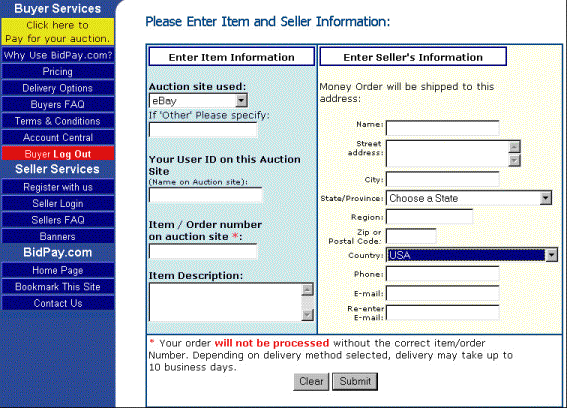 Bidpay provides an easy way to pay by credit card to send a money order in US dollars to any country in the world but because of possible exchange fees is most useful for sending payment to the USA.