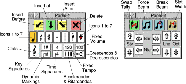 In addition to providing the cursor movement icons described earlier, the Panel-2 window provides four action icons which can improve the appearance of your printed score. These are dealt with in sequence from left to right and numbered 1 to 4 for convenience. See the diagram on page 20.
