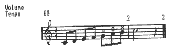 The volume scale is an arbitrary one in which 0 is silent and 126 is maximum volume. In the case of a MIDI instrument, this controls the 'master volume' of the instrument and is quite independent of the dynamic markings (which controls the 'key-on velocity'). It is a good idea to use a standard volume of about 100 so that you have some room for a crescendo. In the case of the Archimedes internal voices, this volume is combined with the dynamic marking to give an overall volume.