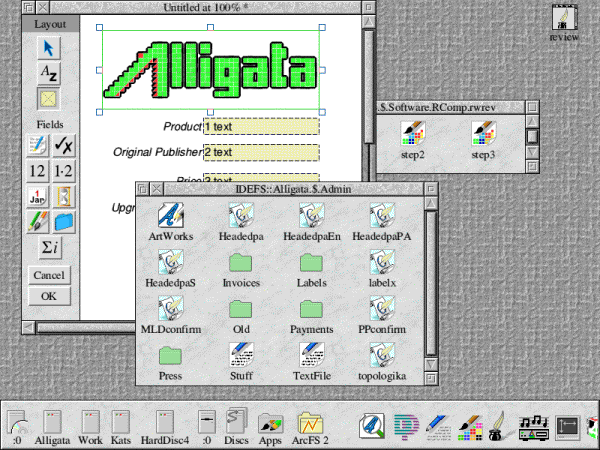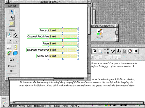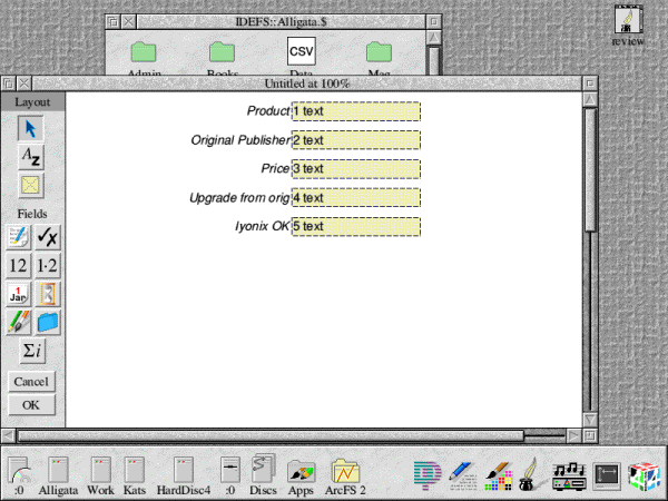Loading DataPower Home is a matter of simply double-clicking on the !DataPower icon, and as such the program will load onto the iconbar. The quickest, and easiest, means by which you can create a new database is by dropping a CSV file onto the DataPower Home icon. This will load the data into the back of DataPower Home's memory, and start by presenting you with a card design screen. We're going to illustrate this process in a number of steps, as given below. ![]() 1. Start by loading !DataPower from your DataPower folder on your hard disc. ![]() 2. With the DataPower Home icon on your iconbar, locate a CSV file on your hard disc you wish to turn into a database. Click on it once, and drag it onto the DataPower icon before letting go of the mouse button. A window similar to that shown will appear. ![]() 3. In this example, I'm producing a simple software database. Let's start by selecting each field - to do this, click once at the bottom right hand of the group of fields, and move towards the top left while keeping the mouse button held down. Next, click within the selection and move the group towards the bottom and right. ![]() 4. Let's add a graphic - in this case, an ArtWorks file. To do so, click once on the frame icon (the yellow square with a cross in it) then within the main window of the database click and drag to create a new frame. Then drop the ArtWorks file from its source location straight into the new frame. If you wish to add text, click on the Text Input button (just above the graphics button) and click where you wish to add it. When you've completed the above, click OK and enter a new filename for the database; then drag it to a suitable location on your hard disc. After a short while you'll find that DataPower Home opens your database with the graphical changes/textual additions you've just made. DataPower Home does include so much more in the way of advanced reporting, but this is an item really best explored yourself. Archive magazine has a regular column looking at the features of DataPower 2, which realistically has some of the truly more advanced reporting functions as well as SQL capability. It wont talk to PCs with SQL server, but this may be something for the future if RComp sell a good few thousand copies. Summing up