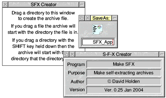 This is a program I originally wrote for my own use. It will create a self-extracting archive from any (reasonable) number of files and/or directories. The output from the program is an archive in the form of an 'Absolute' file (type &FF8) which can be Run by simply double-clicking on it. The idea is to allow groups of files, directories, applications. etc. to be grouped into a self extracting archive which can be sent by email etc. and de-archived without the need for any other programs.
