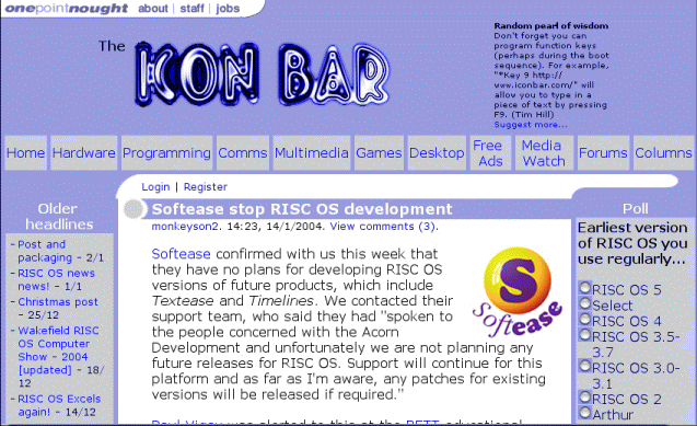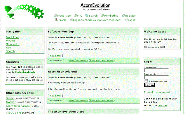 Iconbar The Iconbar was developed as a sister site to Acorn ArcadeA, developing on the original style to offer more general news in a less hard on the eye format. With a simplistic design, and an initial presentation much as you'd expect of a forum, The Iconbar again offers a healthy mix of news, reviews and features. The original aim of having regular columns or resources devoted to a number of different subjects (as indicated through the links at the top of the page) seems to have suffered due to a lack of contributions, but I don't doubt that with suitable contributions being offered the team at Iconbar would certainly put the effort in. As far as news goes, the most prolific contributor to this site is Phil Mellor. With a chatty, yet informative, writing style his contributions are straight to the point and prove to often be an interesting read in the process. Articles often include small graphics, with links to larger graphics were required and the loading speed for the site as a whole is generally very good. Two of the strongest assets of The Iconbar rest in its links at the top of the page. Free Ads and Forum. The Free Ads feature allows RISC OS users to offer for sale, or want ads, for any RISC OS products; with a particular emphasis that commercial bodies are not to use the free ads to sell directly to Iconbar readers. The presentation and method of entering adverts may feel familiar to long-term Acorn User readers; mainly because the same feature used to be available through the Acorn User website when Richard Goodwin was the site editor. So far as Forums go, The Iconbars is the best for RISC OS. Once you've registered, and logged in, to create a new topic it's as easy as clicking a button; to reply it's as easy as clicking a button and so on. Everything appears in a logical layout on the page, and if you wish to jump to opinions from a particular contributor all you need do is click on their name. As a whole, The Iconbar does suffer from occasional long periods without updates; but when it is updated the news is spot on and a helpful compliment to the Forums. If you're looking to chat to like-minded RISC OS users, it's worth visiting the forum of this site just to do so. Acorn Evolution