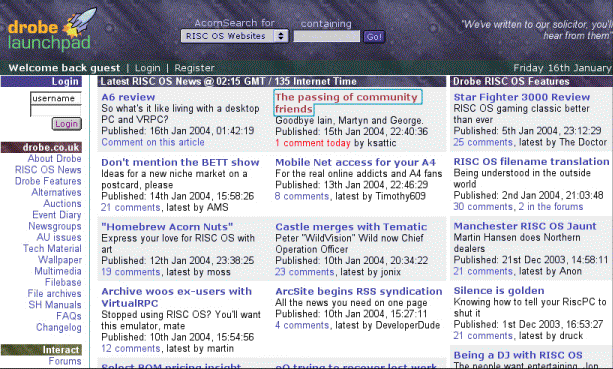 ![]() Drobe For those of you who are more than a little familiar with the Internet, and are still avid users of RISC OS, Drobe is most likely on your list of favourites. Launched by Peter Price in 1998, and taken over by the ever enthusiastic Chris Williams, Drobe aims to be at the hub of every RISC OS Internet users' online experience. At the heart of the site is its news section; featuring easily the most regularly updated source of news and opinions on current news and events. The news items, often sources from comp.sys.acorn.announce, when not fed directly to the editorial team, cover everything from new software to reviews of current hardware. At the time of writing, the A6 from STD has been reviewed. The reviews on offer are written from the point of view of a user, with a keen enthusiasm for the product being reviewed - I thoroughly enjoyed the writing style of Martin Hansen, and his keenness to pass on experiences was only to be commended. Features have a similar enthusiasm behind them; ranging from light-hearted April fools to detailed technical features taking apart the most confusing aspects of a programming language. Towards the left hand side of the opening window, we have the hub of drobe.co.uk. A group of perhaps twenty links, each giving access to a specific feature of the site or a customised link into another site. Highlights include a link to eBay Auctions, specifically searching for RISC OS related items and/or memorabilia and another link through which you can download JPEGS of twenty year old Acorn User magazines. The style of drobe is minimalist; with graphics used only where necessary but this does make loading somewhat faster than a more graphic-rich site; and if the truth be told drobe is very attractive in its presentation. There are features of the site which will not work in all browsers, such as the java chat provided through the site, but regardless of this there is definitely something here for everybody. Iconbar