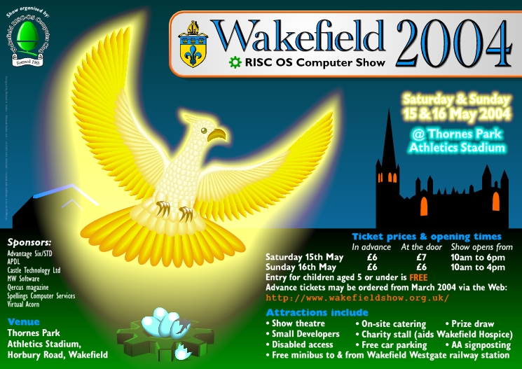 The Wakefield show is going ahead, RISCWorld has the details ![]() The Wakefield RISCOS Computer Club have decided to go ahead with the Wakefield 2004 show. At one point the future of the show was in some doubt, but it's good news as the show will once again be on, and will be in its usual venue of Thornes Park athletics stadium. Last year the show was for one day only, which meant that some people couldn't attend, however this year it will be back to running over 2 days on the 15th and 16th of May. On both days the show will open at 10am. On Saturday it closes at 6pm, and on Sunday at 4pm. ![]() This years show has been sponsored by APDL, Stuart Tyrell Developments, Castle Technology, Finnybank, Richard Hallas, MW Software, Spellings Computer Services and VirtualAcorn. A free minibus service will operate from Wakefield Westgate station to the show. TicketsDue to popular demand the Advance tickets facility will be returning for the show. Advance tickets will be available from March 2004. Ticket prices: 5's and under Free. Advance tickets 6 pounds On the day rates: Saturday £7.00 Sunday £6.00To request your advance tickets by post (from March 2004) send a cheque or postal order made out to 'WROCC Show' to : Wakefield Show 2004 Advance Credit Card orders will only be able to be placed via the show website (http://www.wakefieldshow.org.uk)/from March 2004. The website will also contain the latest show information and the exhibitors list. Exhibitors and moreThe current list of confirmed exhibitors is APDL, Castle Technology, MathMagical software, MW Software, Qercus, Stuart Tyrell Developments and VirtualAcorn. Further exhibitor details will be made available shortly. One company who won't be attending this year are MicroDigital as they have a prior commitment. It would not be a Wakefield show without the usual Show Theatre and Charity Stall, which will again be raising money for Wakefield Hospice. The usual catering will be on hand, and hopefully there will also be another prize draw. Last years main prize was an Omega, what could it be this year? AdvertisingAll of the RISC OS press will be running adverts for the show (designed by Richard Hallas), a sample of one of the adverts, which have been produced in a number of sizes is shown below. ![]() Organisers![]() The show is once again being coordinated by Chris Hughes, who has organised all the previous Wakefield shows, in the past supported by the late Mike Wilson, and now by Steve Potts and Phillip Marsden and of course the WROCC members. The show is organised on behalf of the Wakefield RISCOS Computer Club one of the longest running Acorn/RISCOS computer clubs in the UK. RISC World |
