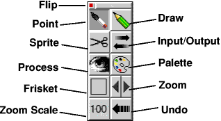The main window is made up of the edit window, called the canvas, and a tool pane. Each tool in the pane is accessed by clicking on it with SELECT . Each tool has its own associated menu which is brought up by pressing the mouse MENU button with the pointer on the canvas.
