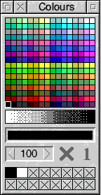 Colours can be selected in a variety of ways. The obvious way is to click on the required colour in the palette window. The chosen colour is immediately added to the block of 16 colours at the bottom of the window. This is known as the Picker. The 16 colours shown are the last 16 that you have used. These 16 colours can be chosen in a variety of ways. You can also select a colour from this block by clicking on it.