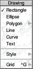 All the items in this menu are drawn in the current colour, which can be changed using the Palette menu. Colour opacity is not implemented in these options.