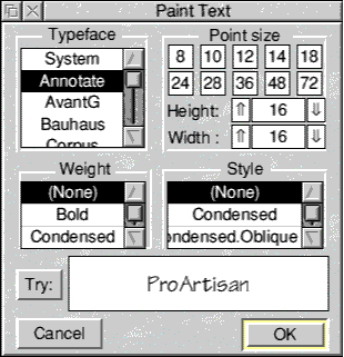 Clicking on Cancel returns you to the canvas without the text at the pointer. It should be noted that Text is not designed to provide anti aliased text. If you place text onto a multi coloured background anti aliasing does not work. The text item provided by ProArtisan 2 is written as a sprite with a Frisket around it. This makes it very easy to rotate and scale the sprite based text and also enables you to add various textures and fills to your text.