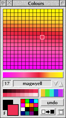 A dip in the sprite poolJust as there is a path pool that stores vector paths, ProArtisan provides a sprite pool; indeed, there's a tool devoted to it (Sprites mode). You can cut sprites out of a picture either by drawing a rectangle around the area you want, tracing an area freehand, or using a magic wand tool. The latter has adjustable thresholds and tries to extract the piece of image you click in a sensible manner. Once you have a sprite in the pool, you can use it as a brush, fill an area with it or apply it to the canvas in a distorted shape, perhaps to achieve a perspective effect. Sprites can also be rotated and scaled, and plotted around a sphere (tiled if necessary). As with the paths pool, the sprite pool can hold many images and they can be manipulated in various ways before placing them on the canvas. Numerous ways of pasting sprites onto the canvas are provided, from simple solid and translucent pasting to fades and feathering.A colourful backgroundA mention must be made of ProArtisan's colour picker, as it's somewhat unusual and hints at the program's origins as a 256-colour art package.In some ways, ProArtisan's colour picker can be thought of as a 'palette pool', in the same sort of class as the path and sprite pools. The point is that, although it's a full 24-bit-colour painting package, ProArtisan organises its colours into palettes of 256 colours each. There are 32 palettes by default, though plenty more are provided on disc and you can modify palettes very easily. The palette-mixing facilities provided by the Colours window are actually very powerful. Any of the 256 shades can be defined directly by using the standard RISC OS colour picker, but dragging between two colours will instantly create a blend, and colours can be reordered by dragging, so creating smooth blends between any number of colours is a quick and easy matter. Sixteen tints of the currently selected colour are also shown in the window, as well as five further complementary shades from around the colour wheel. These are all excellent facilities for artistic work, and make it genuinely easy for a creative artist to get at just the colours he might want with minimum fuss, so the picker strikes me as one of the best-thought-out aspects of ProArtisan 24. It's perhaps just a bit of a shame that only 32 palette slots are available: you can redefine any palette at any time, or replace a palette by loading a new one from disc, but you can't have more than 32 available at once. It's also a great pity that individual palettes can't be saved easily; you can save your palettes to disc, but only all at once, not individually. I can see no good reason why there isn't a 'save current palette' option, and I think that this would be a highly desirable feature for a future upgrade. As things stand, 32 palettes are defined by default but you have to replace existing ones (and save new defaults) if you want to use your own, whereas ideally you should be able to have extra palettes in addition to the existing presets.