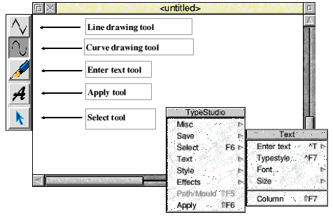 A wide range of effects can be applied to text. Three types of shadow, slanted or mirrored in any direction, 3D, plinth and column. Effects may be combined giving endless possibilities. TypeStudio is intuitive to use, especially to users familiar with Draw. TypeStudio provides line/curve drawing tools, and options to group/ungroup, scale, rotate, and copy objects.