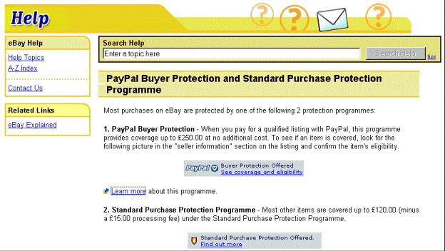 Apart from being a convenient way to pay, however, Paypal offers protection to buyers when things go wrong. This can include non-delivery of an item or the item delivered being very different from the description given. If the seller has Paypal buyer protection then the service level is that much greater and covers up to £250 at no further cost. eBay's own protection scheme covers only up to £120 and charges a £15 fee which makes it useless for items less than about £25 in value.