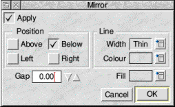 Mirror - This lets you place a mirrored object Above, Below, or to the Left or Right of the original. Gap specifies the distance between the original and the mirrored objects and can be between -100 to 100mm. Style options for Mirror are the same as those described above for the Style option on the main menu except that they only apply to the mirror effect.