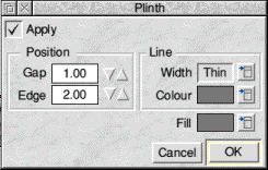 Plinth - The positioning of the plinths is set by two values. Edge specifies the distance from the largest bounding box of all the characters in the text string to the edge of the plinth. By default this is 2mm, but can be between 0 - 100mm. Gap sets the spacing between each of the plinths. By default this is 1mm, but can be between -100 to 100mm. Again the style options for plinth operate in the same way as the options off the main Style menu except that they only apply to the plinth effect.
