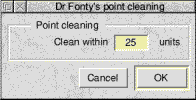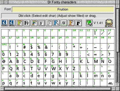 About Dr FontyDr Fonty is a multitasking font editor for RISC OS. He is designed as a replacement for Acorn Computers FontED application. Dr Fonty's requirementsDr Fonty requires RISC OS 3.1 or later and a hard disk in order to work. Dr Fonty can be run on a machine with 4Mb of memory, however iSV Products recommend 8Mb if you wish to load very complex fonts. Dr Fonty will require roughly 2600K of free memory before he will load. Once loaded he will not need to claim any further memory. If your machine does not have enough free memory then quit any applications loaded onto the icon bar and try loading Dr Fonty again. Removing applications from your boot sequence then re-booting the machine may free up more memory. Some applications (such as Impression) can claim a lot of memory and not free it up again even after being quit. Removing items such as !NewLook can also free up more memory. LoadingDr Fonty is loaded by a double click on his icon in a filer window. A title banner will appear, then Dr Fonty will load onto the icon bar. Loading a fontOnce Dr Fonty is loaded a font can be loaded by double clicking on its Outlines file, or dragging it to the Dr Fonty icon on the icon bar. Double clicking on an Outlines file if Dr Fonty is not loaded will not load a font. This is on purpose. It allows you to set up your machine so that double clicking on a font file without Dr Fonty loaded will load the font into FontED. If you load another font after the first one Dr Fonty will ask if you are sure you want to load the new font. Clicking on OK will load this new font and discard the old one. i.e. Dr Fonty can only edit 1 font at a time. You can however load other Dr Fonty/FontFiend files whilst editing a font. For example you could drag a kern file into Dr Fonty to load kerning and add it to the current font. Once a font has been loaded into Dr Fonty his main window will open showing you all the characters. DrawWorks OLE linkDr Fonty can also be loaded by selecting a font in your DrawWorks document and clicking on the Dr Fonty button. In this case Dr Fonty will be automatically loaded and the selected font will then be loaded by Dr Fonty. Dr Fonty's main windowThis is the window that opens when a font is loaded. ![]() The name of the font loaded is shown in the writable icon at the top of the window. Below this is the on-line help icon. As you move the mouse over Dr Fonty's windows this icon will tell you what everything does (Dr Fonty also supports Acorns !Help application). Below this is the button bar, this allows you to quickly open often used windows. The main table below this shows small samples of each character. The buttons on Dr Fonty's main window act as follows. ![]() A single click with any mouse button will perform the required action. Dr Fonty has been designed to operate in the same way as FontED. So for example a double click with SELECT on a sample on the main character table will open the outlines window for a character. A double click with ADJUST will open a scalable filled sample of the character. Those familiar with FontED may wish to experiment. Main Table (Clicks & Drags)Clicking and dragging on the main character table using SELECT or ADJUST will perform the following actions. Clicks