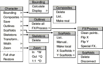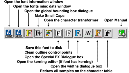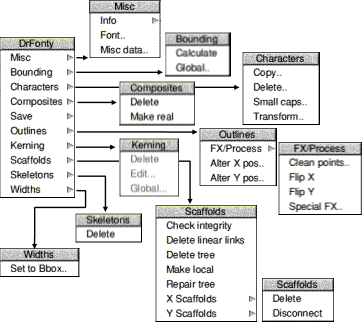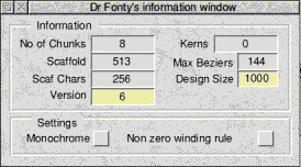 ToolbarThe buttons on the toolbar at the side of the outlines window perform the following actions. ![]() Filled character windowsThese windows provide an example of what the character will look like when rendered by the font manager. ![]() Altering the size of the window will alter the size of the character sample displayed. Clicking with SELECT in one of these window will open the Outline Window for the particular character. If you click SELECT in a filled character window then the appropriate outlines window will open. Dr Fonty's main menuThe main menu for Dr Fonty is opened by clicking MENU over the main table. ![]() The next section of the manual will cover these menu options in detail. The Misc MenuFontThis option opens the font information dialogue box. ![]()