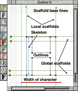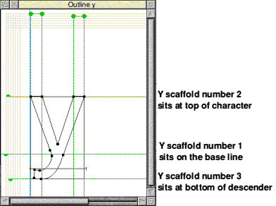![]() As you will have noticed there are different types of scaffold, Wide links and Tangent links. Wide links are used to scaffold rectangular sections of a character, for example the left stroke of the D below. They can also be used for sections of a letter with a constant width, for example the top and bottom of the D. Tangent links are designed to be used to prevent unsightly pips at the edges of curved shapes, for example the right side of the D. Tangents can be left, right, top or bottom. Dr Fonty will try to add tangent links in roughly the right place. ![]() As you can see from the previous two examples applying simple scaffolds is quite easy. There are however a few cases when characters can be more awkward to scaffold. For example, characters such as g and y which have descenders. You may be tempted to place Y scaffold 1 at the bottom of the descender, this would be wrong as you can see from the example below. Y scaffold 1 is still on the base line, scaffold 2 at the top and scaffold 3 is now used to hint the descender. ![]() Moving & attaching ScaffoldsWhen placing scaffolds in the correct place they will of course need to be moved. Tangent links can be moved by simply clicking SELECT on them to hilight them and then holding down SELECT and dragging. Wide links have two handles, dragging the bottom or left handle will move the entire scaffold. Dragging the top or right handle will alter the width of the wide link (up to a maximum width of 253). Attaching scaffoldsFor scaffolds to work they need to be attached to the control points that make up the skeletons and outlines of the character. In the example on page 40 you can see the right hand tangent link selected (red) with the control points that are attached to it also shown red. To attach a scaffold first you need to hilight it by clicking SELECT on its handle, then hold down CTRL and drag out a rectangle. Any control points enclosed by this rectangle will be attached to the selected scaffold. Making global scaffoldsScaffold trees have been discussed several times in this manual, but how are they made? Very simply one character is scaffolded, for example H. The scaffolds for this character are then copied onto another character, for example E. (This is done from the main character table by dragging H on top of E using ADJUST). All of the scaffolds in H will then appear in E as global scaffolds. These can then be used to hint E, although some may need deleting and others replacing with local scaffolds. The process then continues throughout the font, so the scaffolds from E could be used to hint F, for example. Making a scaffold tree can be fraught with disaster as it can be very easy to accidentally break the tree by deleting the wrong scaffold. If you do wish to make a font with a scaffold tree then we suggest that you regularly check the integrity of the tree (Scaffolds.Check integrity) and then save the font as a backup if there are no errors. Should the tree get corrupted you can then re-load the last backup. Zoom & RestoreThis menu will simply zoom the current outline window up or down. This can also be achieved using the buttons on the toolbar to the left of the outline window. You can also restore the size of the window using the 1:1 option. Keyboard shortcuts can also be used to zoom the window in or out (CTRL W will zoom in, CTRL Q will zoom out). RestoreThis option acts as a simple undo feature. Whenever an outline window gains input focus (its title bar goes yellow and the tool pane gets attached to its side) Dr Fonty will make a backup of the character. You can then edit the character (outlines, scaffolds, composites e.t.c.) in any way you like. If it all goes wrong simply click on "Restore" and after a prompt from Dr Fonty the character will be returned to the state it was in before you altered it. Note the restore only works on the last character changed. For example, If you open the outline window for "H" and edit it then open another outline window and edit the character in that you will not be able to restore "H". Dr Fonty's PreferencesDr Fonty's preference window is opened by clicking on "Prefs.." from the icon bar menu. ![]()