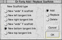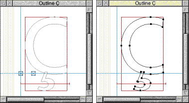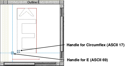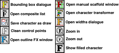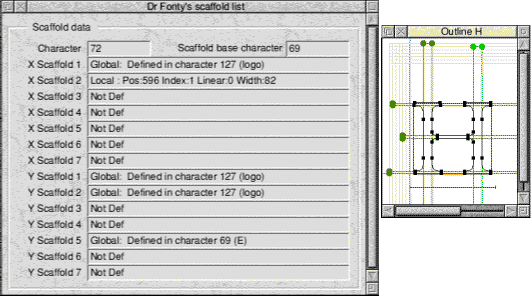 Some of these can be dragged inside the outline window. For example, outline control points, local scaffolds and composites can be dragged about. When you click on an outline control point or scaffold to drag it it will become highlighted. Note If you wish to drag bezier control points from the characters outlines you will need to turn on the option "Render outline control points" from Dr Fonty's rendering preferences window. (MENU on icon bar, click on Prefs..). Clicking and dragging on the outline window: Clicks