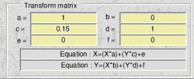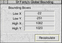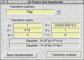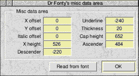Misc data..This option opens the font misc data dialogue box. ![]() RISC OS 3 fonts have an extra misc data area similar to that of PostScript fonts. This area contains extra information about the font. Dr Fonty can work out all the information himself automatically or you can type in new values for any of the entries. Some of these entries purely provide information, for example altering the x height will not actually alter the x height of the font. Cap height, descender, italic offset and ascender also only provide information. However altering X offset, Y offset, underline and thickness will actually alter the way the font is displayed. Note Fonts with a Y offset other than 0 will not work correctly on current versions of Risc OS. The Bounding menuThis menu has two options. The first Calculate will simply re-calculate all bounding boxes for the font. (This will only happen if the option "Re-calculate bounding boxes" is on from preferences on the icon bar. Clicking on Global will open the global bounding box dialogue box. ![]() This dialogue box shows the fonts global bounding box. This is the smallest area that can enclose any character in the font (including accented letters). The recalculate button will force Dr Fonty to re-check all letters in the font to ensure that they will fit into the global bounding box. If any letters do not then the global bounding box will be adjusted accordingly. The Characters menuThis menu is concerned with entire characters (Outlines, skeletons, scaffolds and composites). Copy & DeleteClicking on one these options opens a relevant dialogue. ![]() For example suppose you want to copy the upper case letters on top of the lower case letters. Select the "First" character from the encoding menu as "A". Select the "Last" character as "B", then select to "To" as "a". Clicking on OK will result in "A" being copied to "a", "B" copied to "b" e.t.c. Delete works in the same way as copy except there is no destination character. Copying or deleting characters can corrupt a fonts scaffold tree if present. Clicking on the "Repair Tree" entry in the scaffold menu will fix this. Small CapsClicking on the Small Caps.. option will open the small caps dialogue box. This allows Dr Fonty to make small versions of upper case letters to use as lower case letters. ![]() You can set the size of the small caps in relation to the upper case letters. 100% is the same size as upper case, 50% is half the size. When you make small caps at a size less than roughly 85% of the size of upper case letters the stroke widths of these new letters will then be wrong. These new letters will appear too light in relation to the rest of the font. This can be corrected by using the Outline Effects dialogue box from the outlines menu to alter the weight of the small caps so that they appear visually similar to the upper case letters. TransformClicking on this option will open Dr Fonty's font transformer. ![]() This dialogue allows you to alter the appearance of an entire font, for example to make it oblique, condensed, extended e.t.c. The menu button at the top allows you to choose one of the pre-defined transformations. This will be applied to the entire font, including all outlines, skeletons, composites and scaffolds. For example if you extend a finished font with all scaffolding and composite accented characters in place Dr Fonty will shift all scaffolds so they remain correct as well as adjusting composites, widths e.t.c. Not only can you choose a transformation from the ones on the built in menu you can create your own. This example shows the transformation for oblique. ![]() The important part of this transformation is the 0.15 in the c section of the matrix. This could be altered by typing in a new value (as shown below). ![]() This would make a more slanted font. This new transformation can be saved to disk for later use by clicking on the "Save transformation" button. There are more example transformations supplied on disk. Playing with these along with the built in ones will make this clearer. Each of the variables in the transform window (a to f) have a particular effect on a font when it is transformed.