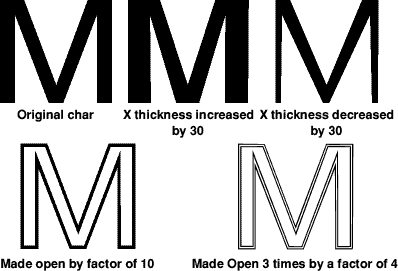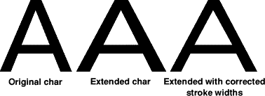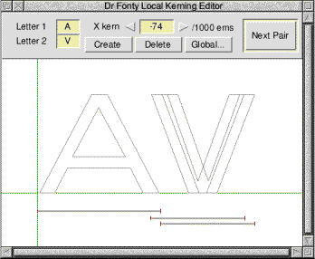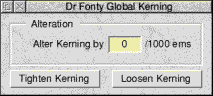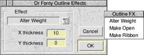 In addition you can use mathematical equations, these can include SIN, COS, TAN, RAD etc. The example below shows the Flag matrix loaded from disk. When you alter a font with a matrix you may need to use the Outline FX dialogue to alter the weight. ![]() Composites menuThis contains two entries, the first is Delete . Clicking on this will delete all composite characters from the font. For example supposing an accented character (Ç) is produced from composites of C and ¸. Clicking on Delete will remove this composite character but will leave the original letters (C and ¸) alone. Make Real will convert all composites in the font to real outlines. The example below left shows a composite character (note the two blue handles). The other example shows the result of clicking on make real. ![]() The Save MenuUsing this menu you can save either an entire Acorn font, a PostScript font (for use with Adobe Type Manager running under Windows) or a kerning file to disk. FontWhen you save a font to disk you will only drag one file icon from the save dialogue box. A font consists of two files (Outlines & Intmetrics). Provided that the option "Save Intmetrics with Outlines" is on from Dr Fonty's preferences window the fonts intmetrics will be automatically saved next to its outlines on disk. PostScriptThis menu has three options. Just like an Acorn font a PostScript font consists of two files (AFM - like Acorn Intmetrics, and PFB - like Acorn Outlines). This menu has a third option which is "ATM info". This saves an info file for Adobe Type Manager. If you want to use the font created directly under Windows then you will need to create this file. If you are going to export the font to a PC/Macintosh font editor then you do not need to save this file. Acorn font names and PostScript names are not the same. Dr Fonty will automatically convert Acorn names to PostScript using the same format as DrawWorks Millennium. This means that you can produce an EPS (PostScript) file and also supply the required fonts on disk with the correct matching font names. KerningYou can save the kerning from one font to disk, then load a different font, then re-load the kerning. This allows you to add kerning to fonts which do not have any, or to swap kerning between fonts. If you do load kerning from one font into another then this new kerning will need to be adjusted using the kerning editor. Outlines menuThis menu is concerned with a fonts outlines. Alter X/Y PosClicking on these will open the X or Y position dialogue box. ![]() This allows you to alter the X/Y position of all characters in the font. For example you could add an offset (often called a left side bearing) to all characters in the font. Using this with a positive value will increase the gap between the start of a character and position 0,0. A negative value will reduce the gap. The example below shows the effect of altering X position by 200 units. ![]() FX/Process menuThis contains a number special options that can be used on a fonts outlines. Clean Points Clicking on this will open the clean points dialogue box. ![]() This dialogue is designed to remove double sets of control points that could cause errors when using the Dr Fonty Outline Effects dialogue box (see page 25). Some fonts have control points very close together, this can cause the "Make Open" effect to have undesirable results. ![]() Flip X/Y The two options Flip X and Flip Y do just that, they flip characters in the font over. ![]() Special FX Clicking on this option will open the Outline Effects dialogue box. ![]() From here you can apply a number of effects to the outlines of a font. For example: ![]() The alter weight option can be exceptionally useful. If for example you make an extended font using the "Characters Transform" option the vertical strokes will be wider than the horizontal strokes. You can use alter weight to restore the stroke width. ![]() In the example above the final character was produced by gradually reducing the X thickness in steps of -4 until all stroke widths were identical. You can of course combine effects. For example you could make a font bolder (increase X thickness) then make an "open" version of it. The Kerning menuThis menu allows access to Dr Fonty's kerning editor. If the options on this menu are greyed out then the current font does not have any kerning. You can of course load kerning by dragging in a kern file from disk. DeleteClicking on this option will delete all kerning from the current font. Dr Fonty will confirm that this is what you want to do before deleting all the kerning. Global..Clicking on this will open the global kerning dialogue box. ![]() This allows you to globally tighten or loosen all the kern pairs in a font. Often the kerning from one font can be transferred to another and only needs to be adjusted globally. For example the kerning from one sanserif font can often be quickly adapted for another. EditClicking on this option will open the local kerning editor. ![]() From here you can edit any of the kern pairs in the font, delete pairs you do not want or add pairs that you need. The display shows the pair of letters to be kerned along with the kerned and unkerned positions. At the top of the window is the current kerning amount. Clicking menu over the kerning display will open a menu for all kern pairs. You can adjust a kern pair in a number of ways. Firstly by typing in a new value into the writable icon at the top of the window. Secondly you can use the left and right arrows to decrease or increase the value. You can also alter the kerning by clicking in the kerning display and then using the cursor keys in conjunction with SHIFT or CONTROL . Making a new pairIf you need to add a new kern pair then type the two characters which need a pair into the top left writable icons and then click on the "Create" button. If the pair already exists it will be displayed, if not it will be created and then displayed. Deleting a pairTo delete a ker
