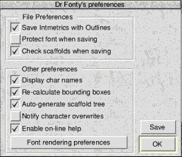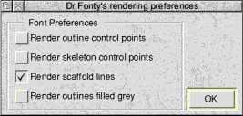 You can save your new preferences to disk so that they will become the new default by clicking on the "SAVE" button. These new preferences can be set as temporary by clicking on the "OK" button. Font rendering preferencesThis window controls how Dr Fonty renders the outlines of characters in the outline character windows. ![]()