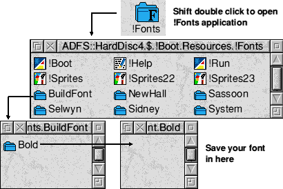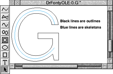 In the examples directory is a directory called "BuildFont". This contains a font and a drawfile. The drawfile contains objects that can be used to make a font. As you can see some letters have already been made and these can be saved out from Draw as selections and dropped onto the correct slot in Dr Fonty's main character table. ![]() Once you have imported a drawfile it will appear on the main character table. If the imported character is in the wrong place then it can be easily moved. For example if you import a character "y" you may find that it is sitting too high up. If this is the case then simply double click on the character in the main table. Its outline window will then open. Click in the outline window to give it input focus (title bar turns yellow) and use the CURSOR keys with SHIFT and CTRL to move the character to the correct place. Adding widthsWhen you import drawfiles they will have no widths. The easiest way to set the widths is to use the "Widths. Set to BBox" option from Dr Fonty's main menu. Use a value of around 50 to start with. This will add a width to all the characters in the font with outlines. The SPACE character must be done by hand using the "Width" option from the Outline window menu for SPACE. The width should be the same as that for I (upper case i) usually this is around 300. Having produced a font with outlines and widths you may well decide to save it and use it. Before saving the font you will need to give it a name in the writable icon at the top of Dr Fonty's main window. The example above shows the name "Buildfont.Bold". before saving the font you will need to make a directory inside a !Fonts application for the font to live. The directory structure you make must EXACTLY match the font name. You can now save your font. ![]() Ole Editing with DrawThe best way to edit the outlines (and the only way to edit skeletons) in a character is to OLE the character to Draw. This is done by clicking ADJUST in the outline window for the character you want to edit. A Draw window will then open containing the outlines and skeletons. ![]() You can now use any of Draws normal editing tools to alter the outlines and skeletons. To return the edited character to Dr Fonty simply click on "Save" from Draws main menu Font Problem solvingThis section will cover some font related problems.