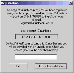 The first thing to do is look carefully at the VirtualAcorn registration window, is there an unlock code already entered? ![]() The registration window In the example above you can see that no unlock code has been entered. if there is no unlock code then it may be that you have done a system restore and simply "lost" the code. Try re-entering the code and see if VirtualAcorn unlocks. If VirtualAcorn still doesn't unlock and complains the code is invalid then check the product ID number in the window, has it changed? If so then some hardware/driver change has happened in Windows, if you have recently disabled any hardware, for example a wireless network port, firewire interface, bluetooth dongle etc then try re-enabling it, having done this try running VirtualAcorn again and it may well start up normally. If the above makes no change then the only possibility left that you can try is to see if a Network Bridge has been enabled by Windows. Windows will often "helpfully" offer to enable a network bridge when one isn't needed, this can then cause chaos and prevent a number of applications from working correctly, including VirtualAcorn. Go to your Start menu, go to Settings and then to Network Connections, if you have a network bridge enabled then right click on it and try deleting it. After the bridge has been deleted try running VirtualAcorn again. If it still won't start then you will need to contact VirtualAcorn technical support quoting your CD serial number and explaining the problem. There is no RISC OS driver for my printer, what can I do?