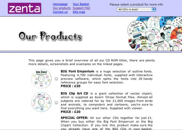 Zenta Multimedia, at www.zenta.com/acorn, have a collection of public domain fonts available in the shape of the Big Font Emporium CD-ROM. For a total of £21 you get a considerable number of fonts, plus copies of Zenta's other CD-ROMs. If you're looking to produce documents where the quality of the typeface isn't of utmost importance, these collections from Zenta (and, if you can find it, the EFF PD collection) offer a nice variety of fonts at a minimal cost.