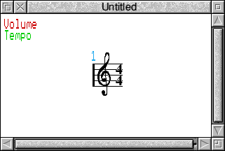 Another way of entering and editing notes is by dragging. Hold down Select or Adjust on one of the note icons on the Panel window. A red note will appear, replacing the mouse pointer. While still holding down the mouse button, move the red note over the score window and release the button. Now providing you do not move the pointer outside the area of the score window, you will remain in insert mode . Every time you click on the score a note will be inserted. If you click with Select, the note's stem will point upwards, and if you click with Adjust the stem will point downwards. Incidentally, the same is true when you click on the yellow or green icons in the Main Panel window: Select for an up-stem note, Adjust for a down-stem note.