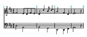Now to put in the middle part. Again, using whichever method suits you best, use the mouse or the cursor keys to position the cursor, select the symbol you need and insert the symbol. Remember that if you insert something in the wrong place, you can always drag it to where it is supposed to be. You will find that you can insert chords by simply adding more notes to the ones that are already there (using the insert-at icon of course). Hopefully you will end up with something like this.