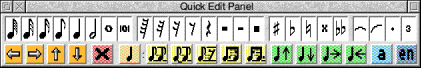 The basic principle governing the operation of these icons is that the selected symbol is inserted at the cursor position in the score immediately. If a similar symbol already exists at that place, it is replaced and if an identical symbol exists, it is deleted. Note that deleting a symbol is often more easily accomplished by dragging it off the score window.