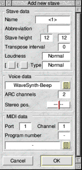 When you double click on Rhapsody's icon bar icon, you are given a default score consisting of one stave only. Obviously you will want to add more staves for other parts. To do this, click on the score with the Menu button to bring up the main score menu, move over the Stave item and click on Add... This brings up the Add new stave window, shown below.