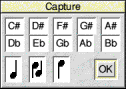 The step capture window also allows you to set certain options before you start. The five double icons at the top determine how the black notes on the piano are transcribed. Normally, Rhapsody will try to transcribe a given note using a note from the scale defined by the current key signature. If this is not possible, it will see if it can find a naturalised note to fit. Only in the last resort will it use any of these settings. One problem with this approach is that, for example, an E# will always be transcribed as an F natural. The only thing to do is to edit it later.