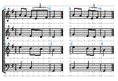 Four of the fonts have default uses. Font number 1 is used for the title (which is printed double this size), for the left and right subheadings and for rehearsal marks. Font number 2 is the normal text font but is also used for the stave names. Font number 3 is used for dynamics markings such as mp and ff and also the centred sub-title. Font number 4 is used for time signatures.