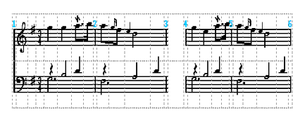 The vertical and horizontal extent of each slot is indicated by faint guide lines in the score. Whenever you insert or delete a symbol from a score, Rhapsody adjusts the slot width according to its own internal rules. For example, minims are generally given a wider slot than quavers etc. Sometimes these rules don't fit and you may wish to change either the space before the note or the space after it. This is most evident when writing triplets in one part against duplets in another. The following example shows such a case. The left section is as Rhapsody transcribes it whilst the right section has been altered. Look carefully and you will see that the first two slots on the altered section have been increased in width, while the third, fourth and fifth have been considerably reduced.