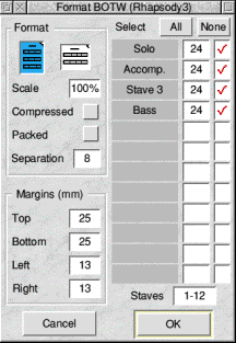 On the right is a list of all the staves. By clicking on the red ticks, you can make a selection of staves to format and print. If you have got a lot of staves, this is made a little easier by providing two icons which select All or None respectively. If your score has more than 12 staves, the icon at the bottom will turn up a new page of 12 staves. The number beside the stave name is the stave height - or rather, it is the sum of the upper and lower stave heights which are specified in the Reassign Stave window (see page 48). If you wish to spread the score out a bit when printing or squash it up a bit so that it will fit on a page, you can alter these settings. Note that this does not alter the data in the score in any way.