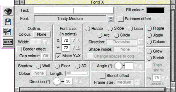The minimum amount of work you have to do to create a drawing is to type in some text and click on 'Create' in the main menu, or on the 'Create' (eye) button in the toolbox, or on the 'Save' (disc) button in the toolbox, or by pressing 'F3' whilst the caret is in the text icon. The resulting drawing will have the default settings shown in the control window whenever you first run FontFX: normally, this means the font will be Trinity Medium, coloured black, with no outline, X and Y font size 72pt and using no other special effects, but it is possible to customise your copy of FontFX to start up (i.e. default to) other settings if you wish. For details of how to use the special effects, or alter any of the other settings, see the following sections.