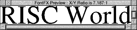 If you select an outline colour, you can also specify how thick the outline should be. There are five settings, ranging from 1 (very thin) to 5 (very thick). You alter the current setting using the arrow icons in the same way as described above for font size and colours. If you produce a drawing with font sizes 72pt, and transfer it to !Draw, the outline width settings correspond to the line width settings in the !Draw menu, i.e. 1 (FontFX) = 'Thin' (Draw), 2 = 0.25 points, 3 = 0.5 points, 4 = 1 point and 5 = 2 points. If you create your drawing to a different size, the point width of the outline will be scaled accordingly, e.g. font size 144pt, FontFX outline width 5, gives !Draw line width 4 points.