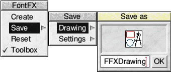 Depending on your personal preference, there may be a 'toolbox' attached to the left-hand side of the main control window. This has icons which create and display the drawing, create and open a save box for the drawing, open a save box for the control window settings and finally reset the control window to normal settings. Whilst your mouse pointer is within the main control window, clicking MENU will normally produce the 'main menu' which duplicates the toolbox functions and allows you to switch the toolbox on and off. The only exceptions to this are when the mouse pointer is above the fontname icon (in which case the font menu appears) or the stencil size icon (in which case the stencil size menu appears).