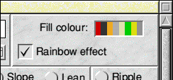 To alter the sequence of colours in the rainbow effect, click over the fill colour icon in the main control window (which will become 'stripy' as soon as the rainbow option is selected). Instead of the colour picker, a window will appear showing the current rainbow sequence. If you just want to alter the colours in the sequence, click on the appropriate colour icon to open a colour picker box. If you want to extend or shorten the sequence, click on the up or down arrow beside the box telling you how many colours are in the sequence: this can be from a minimum of 2 to a maximum of 16. If you reduce the number of colours, the appropriate icons in the sequence will be greyed out: if you extend the sequence, the appropriate icons will be reactivated. Note that when you save either default settings or a script file (about which more below), the rainbow sequence will be saved in the file.