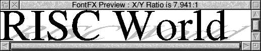 Slope also uses the angle setting, but this time, whilst the baseline and horizontal element of the characters are rotated, the vertical element of the characters is not. For example, a slope of 45° would mean that the horizontal bar of a capital T would be at 45° (instead of the normal 0°), but the vertical bar would remain at 90° as normal. Using slope can give some strange effects: a slope of 90° or 270° makes the string disappear altogether, so FontFX won't let you do it! Any slope between 95° and 265° gives a mirror image of the string in the Y-axis.