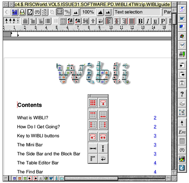 ![]() Wibli and TechWriter If your EasiWriter document is fully-maximised (i.e. fills the whole of your desktop), then the Side Bar may not be visible. If that's the case, then click with Select on the Green button on the Mini Bar, and the Block Bar will appear within your document. The Side Bar and the Block Bar are functionally the same. Clicking with Adjust on the Blue button on the Mini Bar will cause the Block Bar to close and the Side Bar to open. The Blue, Red, and Green buttons on the Mini Bar perform the following functions: