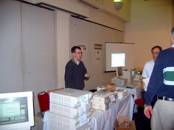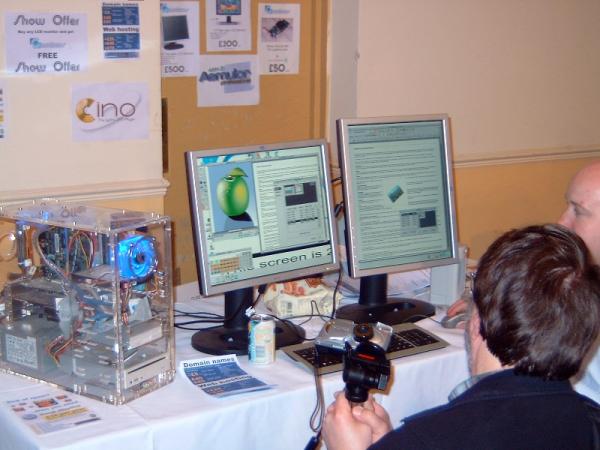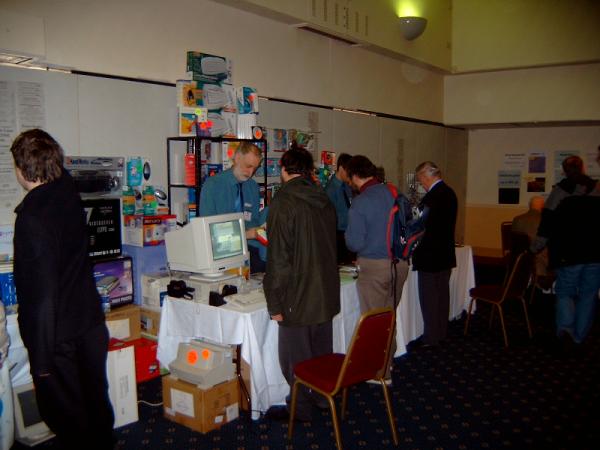 Aaron's action packed show report live from the day of the show at the Webbington Hotel... Those of you who remember my show report from last year will recall that on the morning of the show everything was covered in snow, well this year it was different. On the morning before the show Bracknell was covered in snow. While the rest of the country had been freezing we had been quite nice and warm thank you, however the fiendish British weather must have noticed that we had got away with it so far and decided to dump all the remaining snow on us. Luckily by lunchtime the roads were clearing, although the snow was still falling. So would it be safe to venture down the motorway? Well I had just had four new tyres fitted to the Shogun to replace the Goodyear racing slicks that had just scraped through an MOT. Plus, of course, if I didn't go I would still have to pay for the hotel room, and the stand....no it's too much. I will have to go. .So off I went, and within 10 miles the snow had stopped and there wasn't a trace of it on the ground, the roads were dry and the sun was shining. I carried on down the M4 only getting slightly delayed by a gritting lorry. Presumably the road was being gritted now because there was no chance of all the high quality grit being washed away by any snow. So just over two hours later I pulled into the Webbington Hotel and immediately parked round the back in the loading bay, which was suspiciously empty. Where was everyone? The tables were arranged but of exhibitors there was no sign. I checked in. "Yes Mr Holden has already checked in." And then gone to bed I assume. I found my room, which was number 2, which my tiny little mind found rather amusing. Even more amusing, Dave Holden was number 1. Having had time to be organised this year I had bought my floor plan so I knew where my stand was. But wait? What's this crappy old wobbly table doing here? I deftly swapped it for one on someone else's stand. Having all but set up Dave Holden finally appeared sans floorplan. Well he's always next to me, since we both know what the other sells we can cover each others stands when one of us needs to get a coffee. So Dave sets up APDL next to me. Just as he finishes John Stonier the show organiser appears. "Dave your stand is over there! What are you doing here?" I hide behind a pillar whilst it's sorted out. Dave wins by playing the "Well I've set up now" card and keeps his stand. I now come out from hiding and watch as all the other tables are re-arranged to sort out my mistake. Oh look, the bar's open. Over the course of the evening a number of exhibitors arrive and set up. An interesting rumour starts, apparently "someone from the health and safety people will be coming round to see if any second hand computers being sold have a valid test certificate". I'm not convinced. Dave Holden isn't convinced. In the end after a long discussion nobody is convinced. After all who could possibly benefit from there being no secondhand computers on sale? Of course I'm not selling any second hand computers but that doesn't stop me getting my 25 quids worth in. Finally the noise in the bar gets too much and I head for bed. Luckily this year my room is at the end of a corridor and I don't get woken by any ARM Club drunks during the night. Next morning dawns clear but cold, just like the tea I have tried to make, yes the kettle doesn't work. Luckily the shower is also a matching accessory and offers a fine choice of cold water. I have a bath and head for breakfast. Ah that's better, it's self service, I cram a plate full of sausage, egg, bacon, sausage, bacon, mushroom, egg and sausage and sit down opposite Paul Beverley. We discover that we both drink Earl Grey tea, I protect my teapot like a crouching tiger, but no, he has to go and finish setting up. I return to the self service breakfast, my tea safe, I can see the worried faces, will I leave any food for anyone else? I check out of my room, "Did you have the prawn salad last night?" Yes, surely you don't want it back? No, it's just they mixed up all the dinner bills and tried to charge Dave Holden for everything. I thank the receptionist for her attempt to lower my bill and head into the show. I set up the laptop and arrange the stock and then have half an hour to wander around before the customers are allowed in. At this point I discover that there seem to be customers in already. "Those are just helpers", well they seem to be helping themselves to the prime stuff from the charity stall, oh well. By 10 o'clock I have another "Is the show open yet?" moment. "Yes", says a passing customer, and he was right as within minutes I am inundated and have a very busy morning. Annoyingly I miss the first talk from Castle Technology, called Castle Matters. "Oh look they've missed out the doesn't" quips an unnamed exhibitor. It's such a good gag I recycle it myself later. I collar a keen looking customer as he leaves the lecture theatre, was the Castle talk interesting? "No". Before I can get an expanded answer he wanders off. Oh well thanks for your help sir, I was only trying to get information for a show report. Now I'll have to wait for the report on Drobe to find out what happened. ![]() Peter Naulls At this point I would normally go through the automatically generated show text, something along the lines of "<name of exhibitor> had a crowded stand and was demonstrating the latest version of <name of product> to excited customers". However I can't be bothered. So instead here are some pictures. ![]() RComp busily selling the latest upgrade or something ![]() CJE Micros.....kitchen sink ![]() You'd like to buy an Iyonix sir? ![]() It's Geminus Jim. The most interesting new item on display was the latest version of TechWriter from Icon Technology which did look quite funky with it's new macro scripting language. APDL have now started bundling sets of Fourth Dimension games together and have a flight simulators CD. Whilst Dave is away getting 