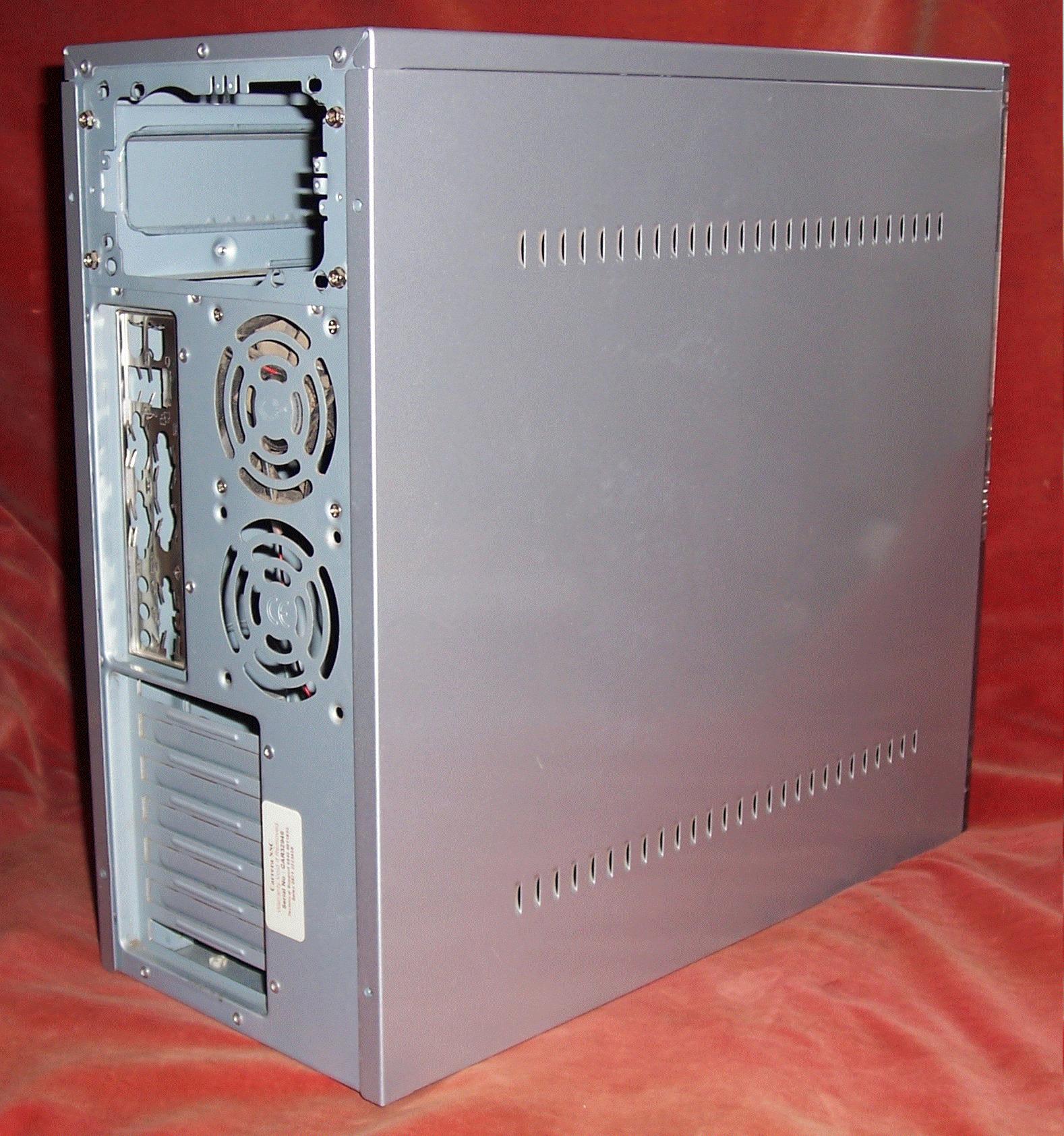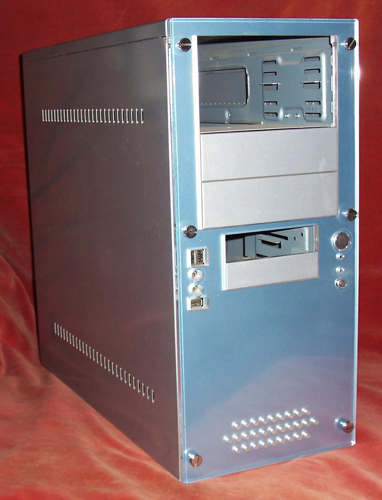 A general view of the case is shown below. As you can see it has the usual removable sides, much better than the old style cases where the top and sides were a single piece. The front of this case is slightly unusual in that instead of the usual contoured plastic moulding it consists of flat sheet of coloured steel covered by a thick piece of transparent acrylic. I quite like this appearance, and cases like this are readily available if you do too. However, although the case's appearance is different from the more usual type with a moulded, contoured plastic front its construction is almost the same.