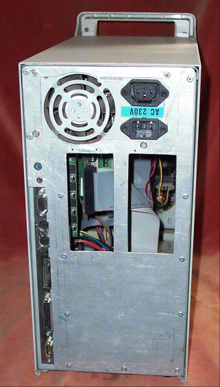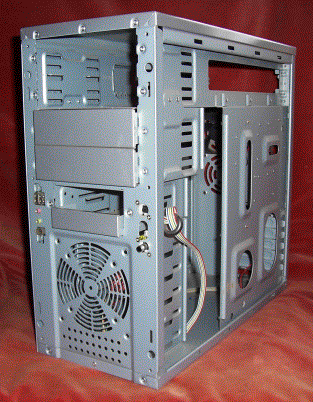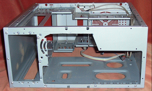 The next picture shows the rear of the case. At this stage the power supply has been removed and it still has the standard arrangement for fitting a full size PC motherboard. When choosing a case look for something with a similar appearance to this with six or more slots for expansion cards. Cases with only four slots are intended to take a "mini ATX" motherboard and may not be large enough to take a RiscPC board. It is often possible to use a mini ATX case but you will almost certainly need to use a smaller power supply and it will require a lot more work, so best avoided, at least for your first attempt.