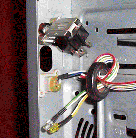 Opposite these on the right hand side of the case are, at the top the power switch, at the bottom the reset button, and between them the hard drive and power LEDs. The two LEDs are waving about on the ends of their leads with the front panel removed as they are secured by fitting them into sockets in the front panel.