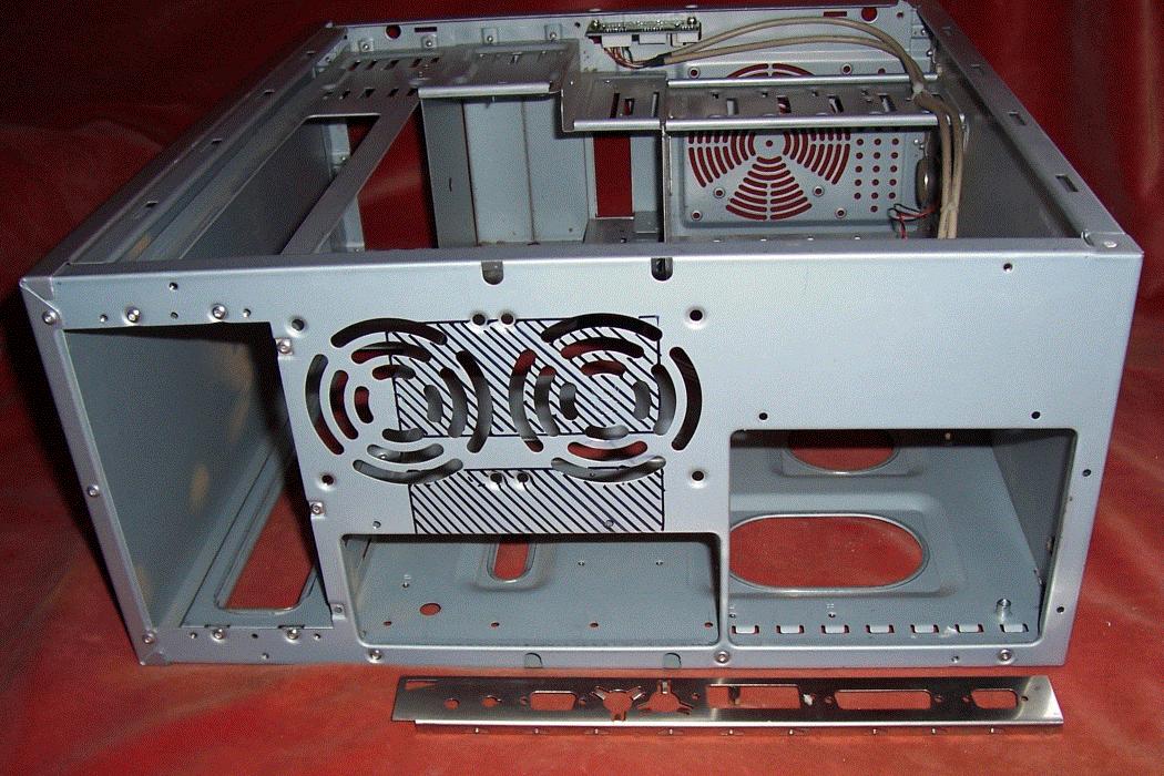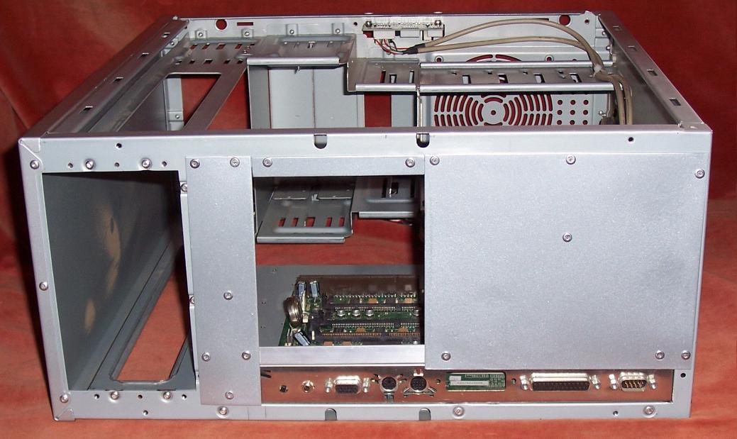 The following picture shows the case with this section removed. Laying beside the case is the backplate from a RiscPC motherboard to give some idea of scale. This demonstrates that with this type of PC case there is plenty of room for the motherboard.