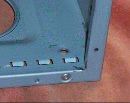 The first stage is to remove the recessed section which holds the expansion cards and the cutouts for the other ports. This is usually retained by a series of pop rivets around its outer edge. Drill out the rivets (it's best to use a small drill in case of mistakes) and you should be able to remove this section as shown below. When extracting the rivets make sure you only drill the ones that hold the part of the case you want to remove. There may be various other rivets in this area which hold other parts of the case. If you do accidentally drill a wrong rivet don't worry, you can easily replace it as long as you haven't enlarged the hole!