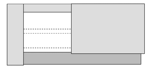 The darker rectangle represents the motherboard backplate. The three lighter shaded rectangles are the main sections of the new back of the case. The two smaller rectangles drawn with dotted lines represent pieces which are used to fill in the gaps between the two pairs of podules cutouts and between the lower pair of podule cutouts and the top of the motherboard backplate. Obviously if you are using a desktop case which is not high enough to accommodate a four slot backplane or if you are using only a two slot backplane for other reasons then the upper aperture won't exists and so there will be no need for the section between the two openings.